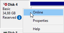 In case you don’t receive above screen while opening Disk Manager you will need to right click on your disk and choose “Online”. After that you will be able to right-click the disk again and choose initialize.