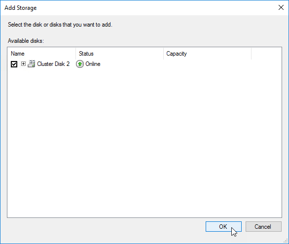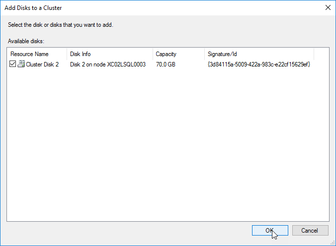 Add all the disks to your resource that your created in previous steps. Just check the disks you want to add to your cluster resource and click on OK.