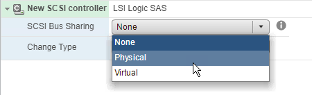 First we’ll start with adding a second SCSI controller to the VM. Shutdown both nodes and “Edit Settings” of your VM. In the New device list choose “SCSI controller” and click on “Add”.