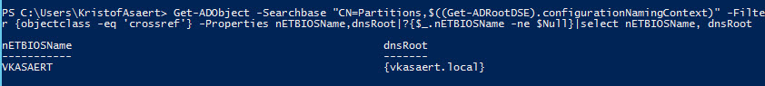 Get-ADObject -Searchbase “CN=Partitions,$((Get-ADRootDSE).configurationNamingContext)” -Filter {objectclass -eq ‘crossref’} -Properties nETBIOSName,dnsRoot|?{$_.nETBIOSName -ne $Null}|select nETBIOSName, dnsRoot