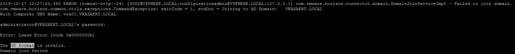 There you will encounter the error that the “OU format is invalid”. When you search this error you will find this Vmware KB. Here they mention that the only option is to put your Netbios Domain name in uppercase.