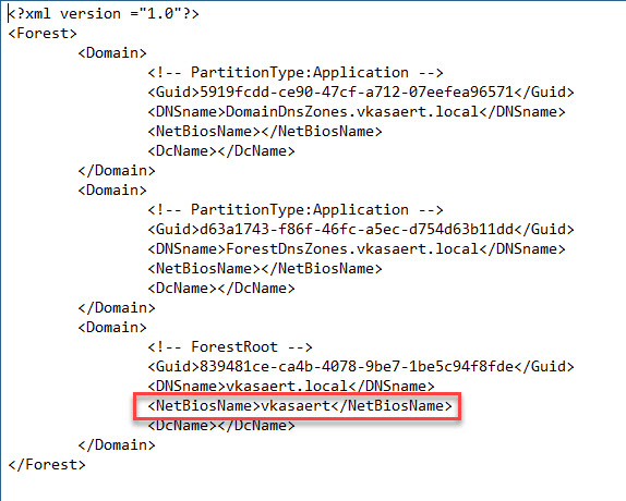 The file is located in the same directory where you executed the command. Open “DomainList.xml” with Notepad and change the highlighted lowercase NetBiosName to uppercase. Save the file so your changes to uppercase are saved.