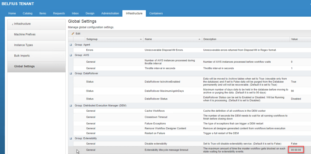 At a certain point in time we had an issue that we exceeded the global timeout of a workflow. In case you need to increase your global timeout you can change that in => Infrastructure => administration => global settings