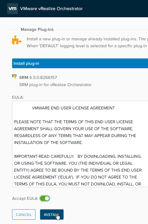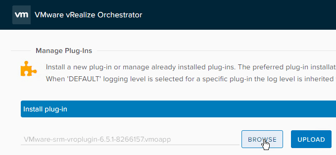 Once you downloaded the plugin you will need to install it. Go to https://fqdn_vra:8283/vco-controlcenter/config/#/ and login with root.