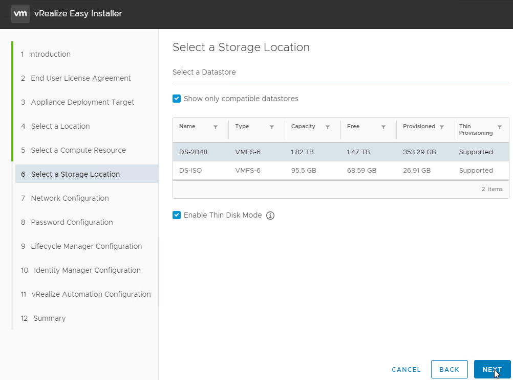 Select your storage and click on Next. Because I have a homelab I’ve chosen to enable “Thin Disk Mode”.