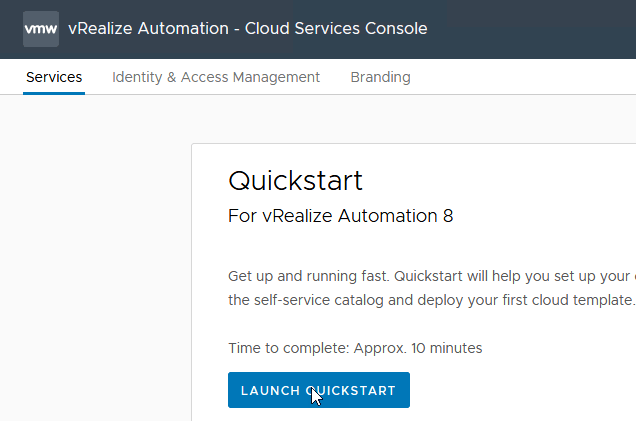 Now we’re going to connect to our freshly deployed vRA instance. Go to the fqdn of your vRA appliance in my case https://vra8.vkasaert.local and connect with the default configuration admin you configured in step 10 of your deployment. The password is the one you configured in step 8.