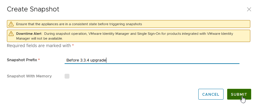 Take a snapshot of your VIDM appliance, again preferably an offline snapshot.