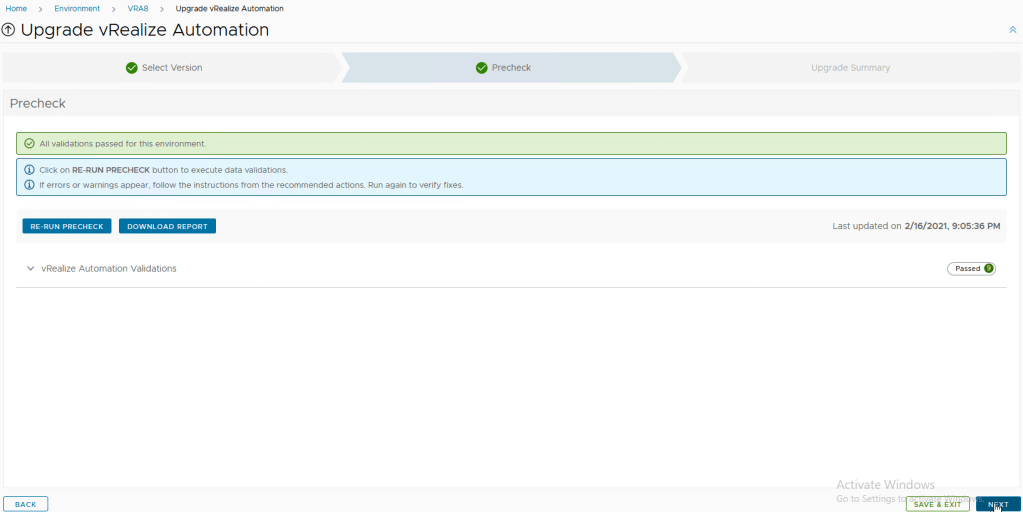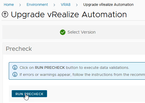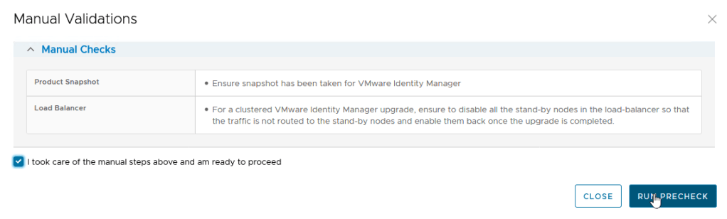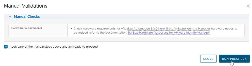 Check the box to say that you took care of the manual steps and then click on “Run Precheck”