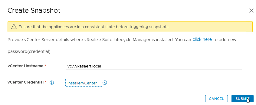 Enter the name of your vCenter. For the vCenter Credential you can select the “InstallervCenter”. This one contains the correct credentials for creating the Snapshot.