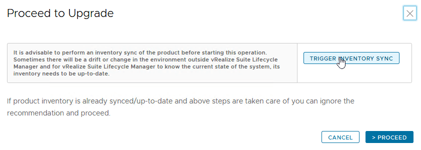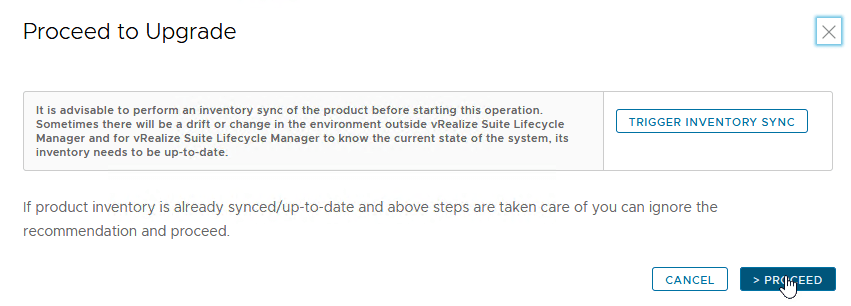 Once the sync is finished go back to your Environments. Go to your VRA8 environment => View Details. And click on upgrade again. Now your ready to proceed your upgrade. Click on “Proceed”