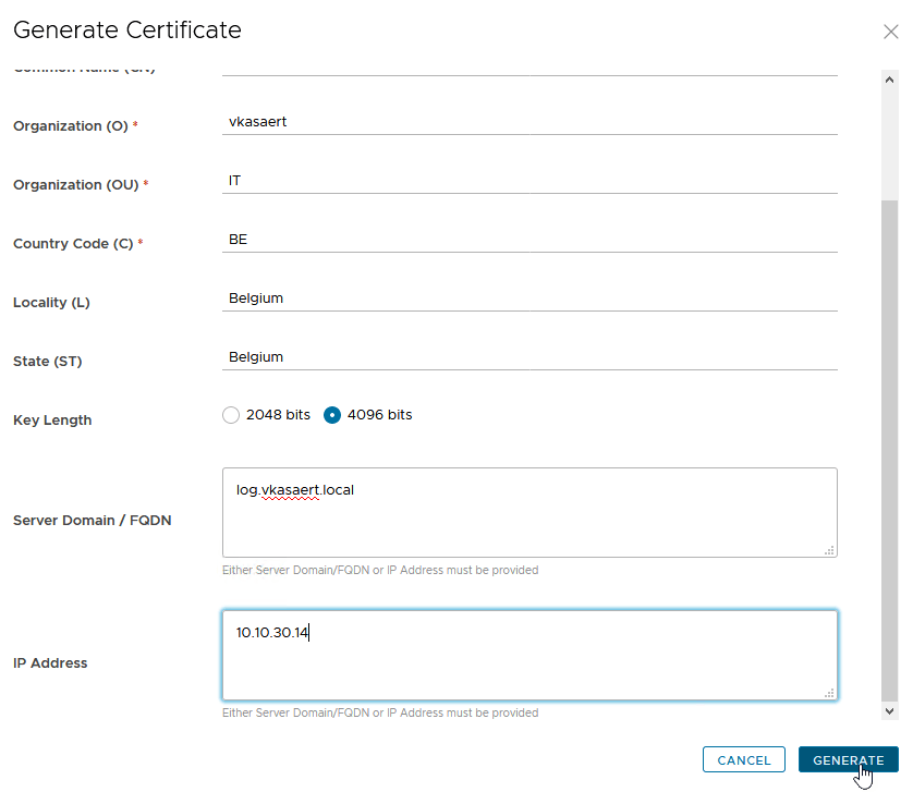From here we start the vRealize Operations configuration. Also for vROPS we will need to create a certificate. Click on “Add Certificate” and choose “Create Certificate”