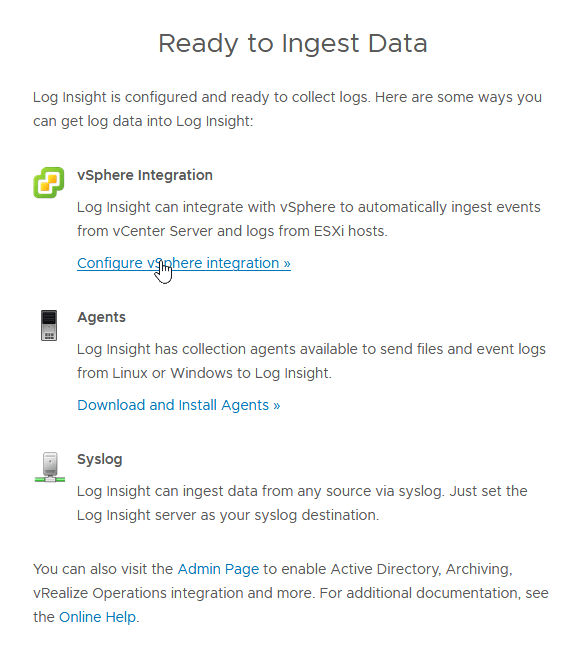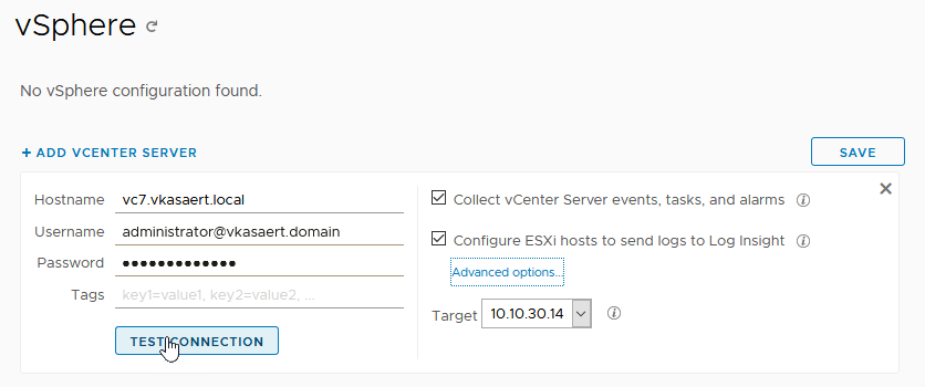 Log in to your deployed “Login Insight”, for me that was on https://log.vkasaert.local with the userid “admin” and the password that you configured during your deployment.