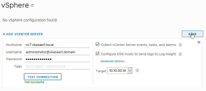 Fill in the details for your vCenter and skip the credentials for your actions user. We don’t have one yet.