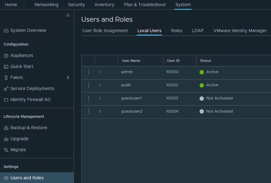 Let me first start with the GUI. You go to “System” and then go to “Settings” and “Users and roles”. Here you can see that the status is “active” but before I started it was in a red status.
