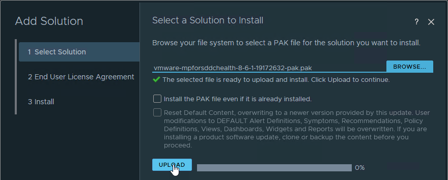 Browse to where the .pak is downloaded and click on “Upload”