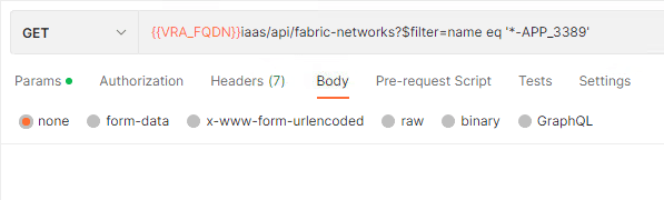 You simply add ” ?$filter=name eq ‘*-APP_3389’ ” behind your request => /iaas/api/fabric-networks?$filter=name eq ‘*-APP_3389’ This will only show you the fabric networks that ends on “-AP_3389”