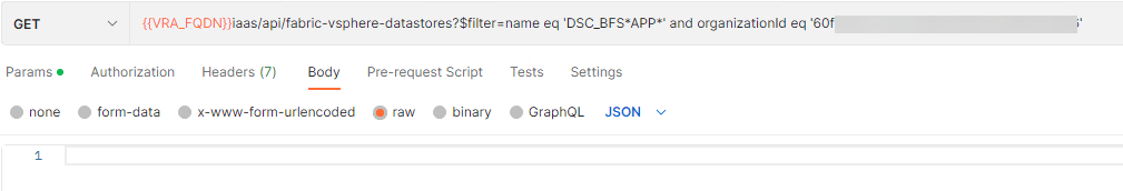 - datastoreId: the ID of the datastore or datastore cluster you want to assign to this profile. /iaas/api/fabric-vsphere-datastores In my case I had replicated storage on both sides so I used filtering to make sure that I was getting the rigth ID. Send a GET to /iaas/api/fabric-vsphere-datastores?$filter=name eq ‘DSC_xxx_xx-xxx_03_SVS’ and cloudAccountId eq ‘055b7cf7-xxxx-xxxx-xxxx-xxxxxxxxxx’