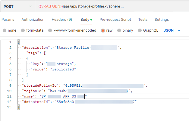 Once you gathered the necessary information we’re executing a POST command to /iaas/api/storage-profiles-vsphere