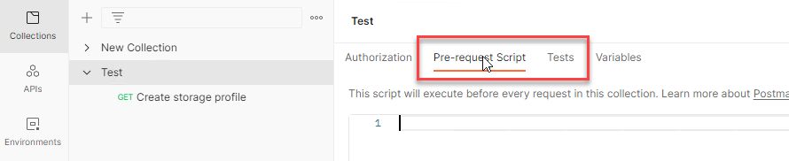 I found it easier to create a new Collection, where you move your POST request you want to execute. In the printscreen you can see that I created a New Collection “Test” and I added a New Request “Create Storage Profile”