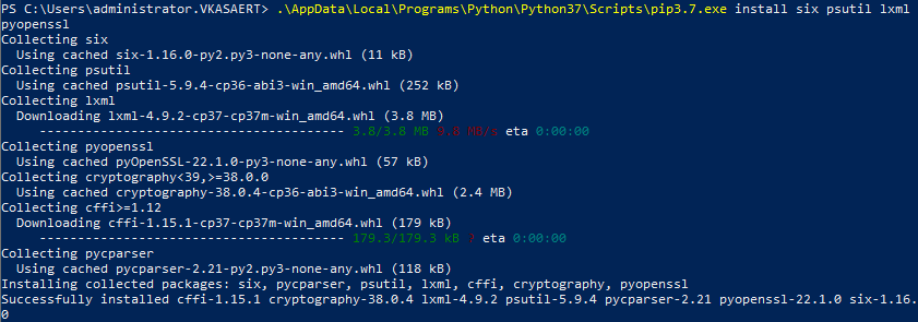 Install the required extra packages .\Appdata\Local\Programs\Python\Python37\Scripts\pip3.7.exe install six psutil lxml pyopenssl