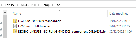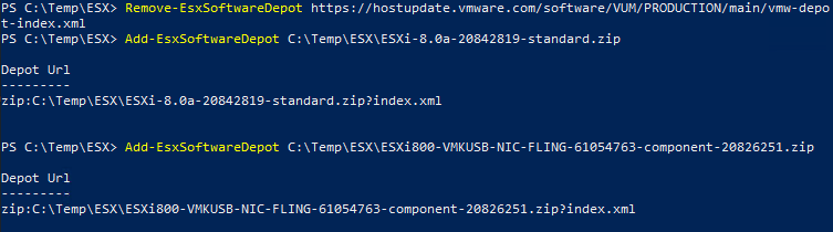 Once the image is downloaded we remove the SoftwareDepot and we add both files in our SoftwareDepotRemove-EsxSoftwareDepot https://hostupdate.vmware.com/software/VUM/PRODUCTION/main/vmw-depot-index.xmlAdd-EsxSoftwareDepot C:\Temp\ESX\ESXi-8.0a-20842819-standard.zipAdd-EsxSoftwareDepot C:\Temp\ESX\ESXi800-VMKUSB-NIC-FLING-61054763-component-20826251.zip