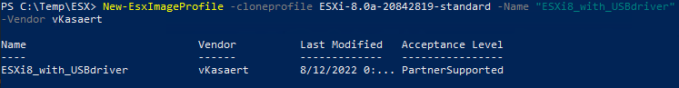 With this command we’re creating our new ImageProfileNew-EsxImageProfile -cloneprofile ESXi-8.0a-20842819-standard -Name "ESXi8_with_USBdriver" -Vendor vKasaert
