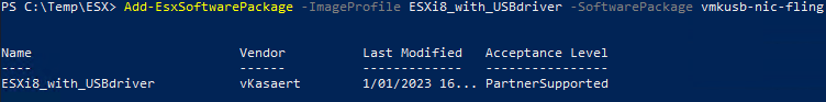 In this step we’re adding the USB driver to the ImageProfile we created in the previous step.Add-EsxSoftwarePackage -ImageProfile ESXi8_with_USBdriver -SoftwarePackage vmkusb-nic-fling