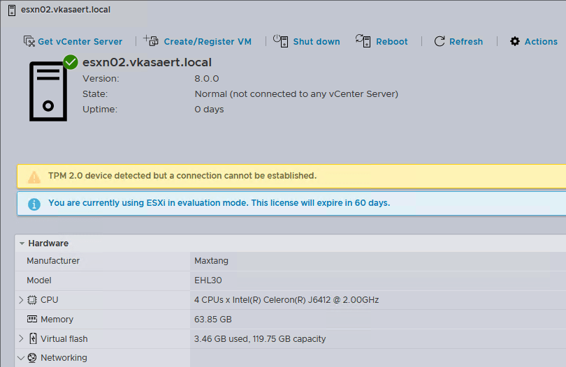 If you know my kind of luck, you will know that my issues aren’t done yet. Installing ESXi with the custom image started, but at 73% I got an error message “no vmknic tagged for management”.
