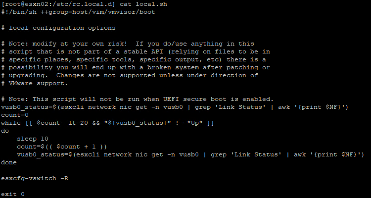 To make sure the USB NIC remains persistent after reboot you need to edit the /etc/rc.local.d/local.sh file. Add below text to the file and save it.