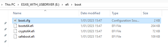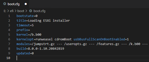 Alternatively, if you want to avoid this failure at 73% you can edit the boot.cfg config on the bootable USB drive that you created. Go to /efi/boot/ and edit the boot.cfg file.