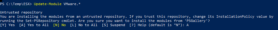 Reason for that was because I was still running an older version of powerCLI. Meaning it was time to update my modules π Update-Module VMware.*