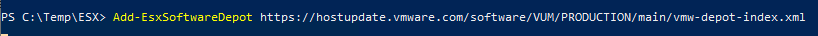 First we’re going to add the software depot from the VMware website.Add-EsxSoftwareDepot https://hostupdate.vmware.com/software/VUM/PRODUCTION/main/vmw-depot-index.xml