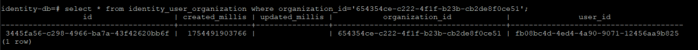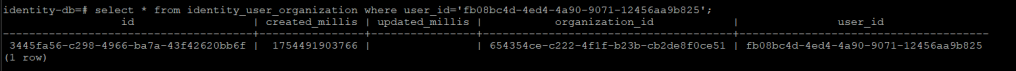Now we will check which userid is assigned to your organization:select * from identity_user_organization where user_id='yourUserID';