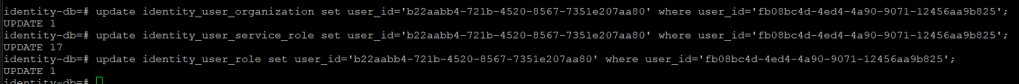 Now we will update the wrong links with the correct userid. You will see that in the update statements we take care to only update the wrong entries.update identity_user_organization set user_id='b22aabb4-721b-4520-8567-7351e207aa80' where user_id='fb08bc4d-4ed4-4a90-9071-12456aa9b825';