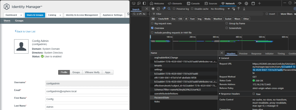 Now we will check in vIDM the ID of the UserID which should have access. You start the developer tools in your browser and you go to “Users & Groups” and you click on your UserID. If you go to “PasswordState” you will find the ID of your User in the Request URL. I highlighted it in blue. So in my case the ID = b22aabb4-721b-4520-8567-7351e207aa80