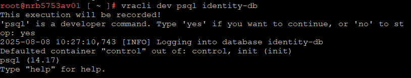 First login to one of your vRA appliances and make a connection to the identity-db.vracli dev psql identity-db